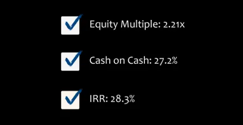 While exact percentages will vary from one investment to the next, you will receive the same TYPES of returns across the board. Cash on cash returns are paid out throughout the lifecycle of each investment. You will also receive a portion of the profits from the sale of the asset at the end of the project.